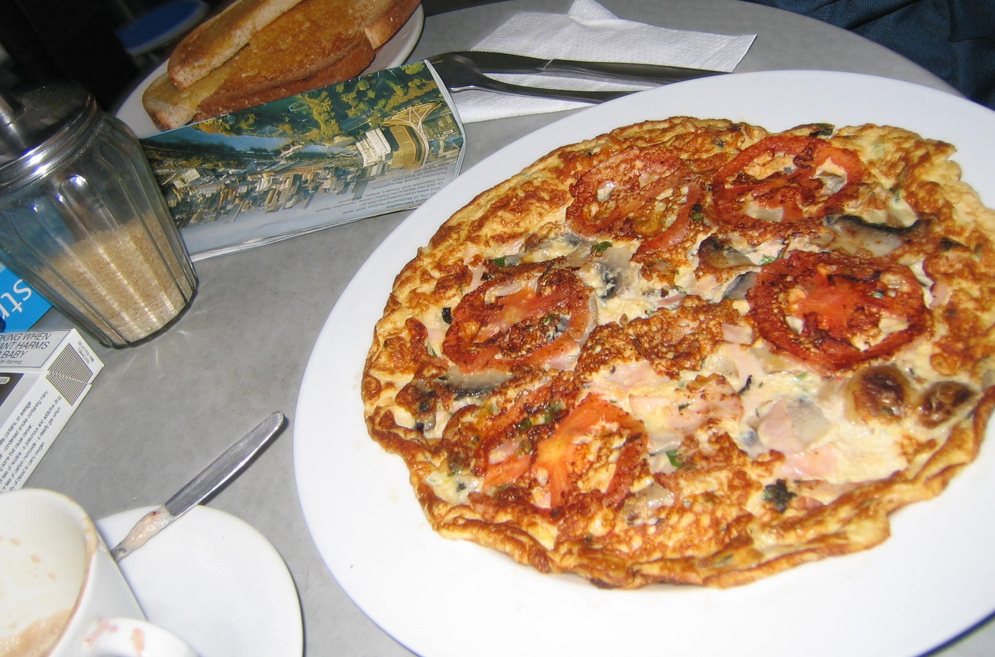 It was a nice, little Italian café. The inside had the typical fridge will all sorts of bread, cheese, pastries, fruit and salads and even by looking at all these I could be content. (Well, not actually.) The chef was a guy in his 50’s, looking tired from life, but apparently very polite and very helpful. He seemed to be taking his time when fixing a sandwich to the person waiting in-front of me to get served. The great thing with the café, though, was the outside. It was not fancy, it was not stylish, but it had just three tables, two of which were squeezed next to each other on a small veranda- just 40cms above ground. When I looked at it, I just saw myself enjoying my big omelette there…Awesome! Just what I had in mind!