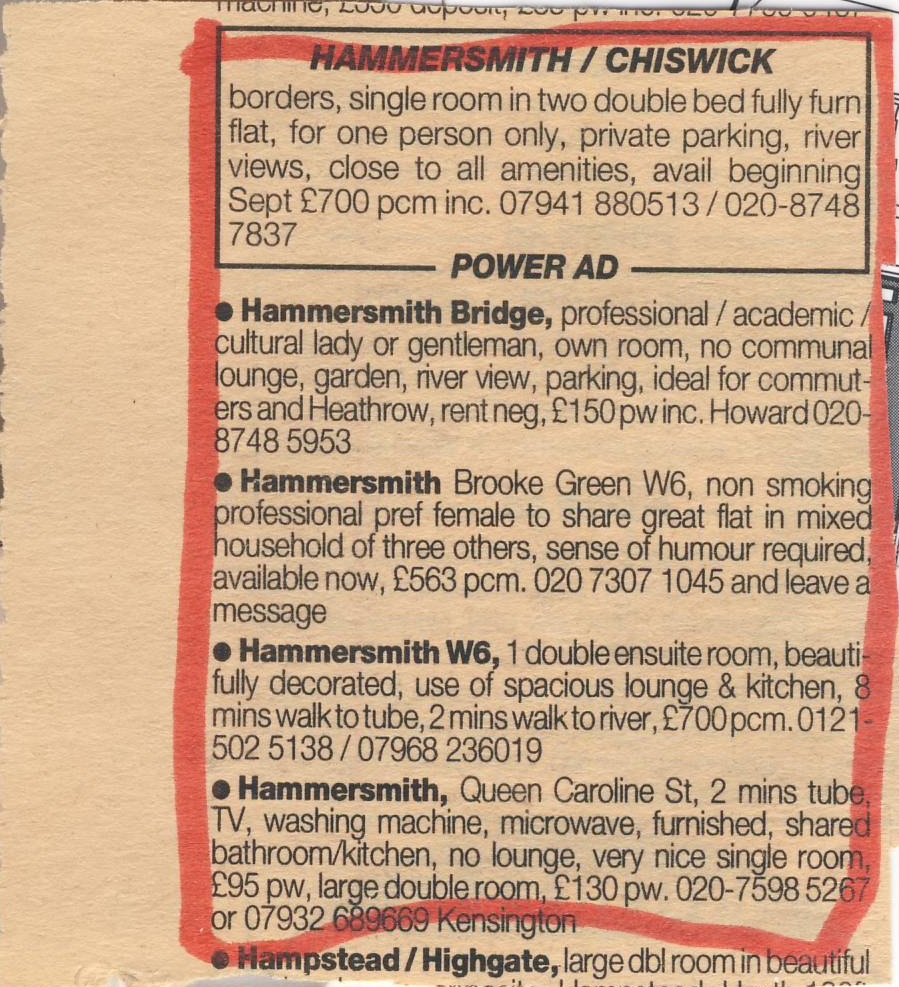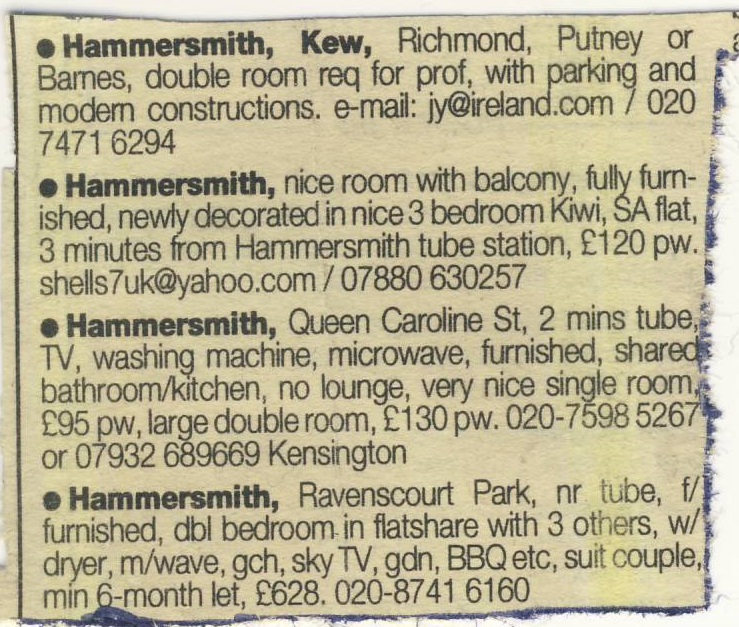 I woke up at 07.00, had a quick breakfast consisting of two cups of black coffee and looked once more in the newspaper, making a new search adding into my list even more expensive locations. I added the whole of Kensington area, where rents were up to 600-800 GBP per month, but under the circumstances I could even do with those!