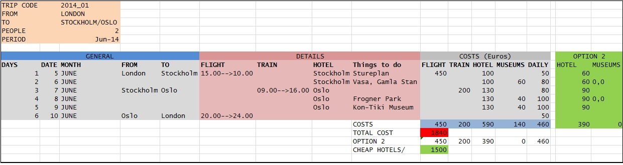 The flight, train, hotel and things-to-do columns are included and the relevant costs are portrayed and summed up. As cost may have been too high, the OPTION 2 (Cheap hotels, no museums) was calculated to 340 Euros less!