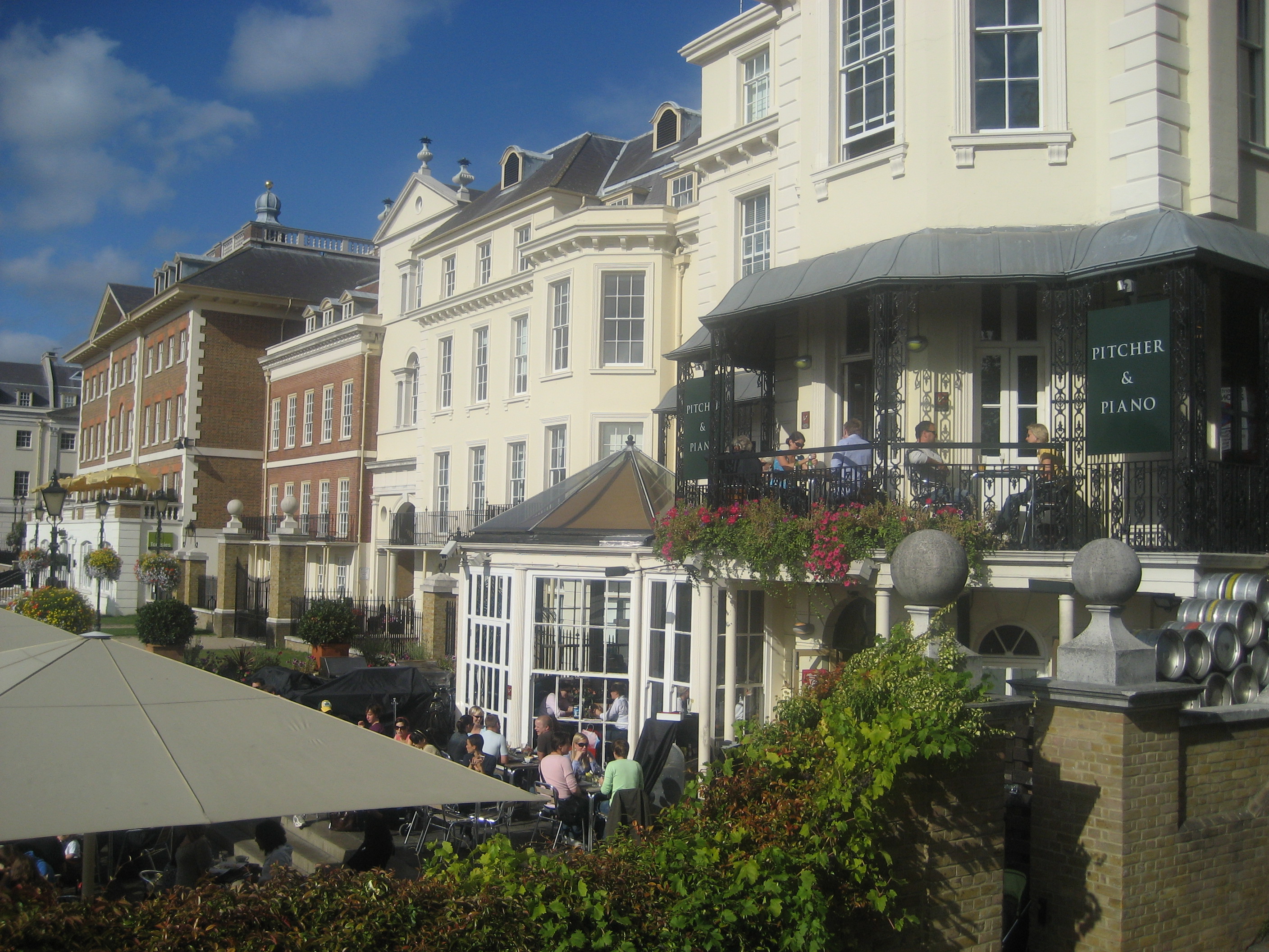 If you are feeling a bit more posh, then try Richmond, by the bridge. On a sunny Saturday or Sunday it is just packed with people and you can just get a beer and lie on the grass. All walks of life ..walk in front of you and they are a nice trigger for funny discussions. My choice would be Pitcher and Piano (http://www.pitcherandpiano.com/where-are-we/london-richmond) just next to Richmond Bridge. Get out of the tube, enjoy a nice walk to the bridge – especially if it is Saturday – and find a nice table in the P&P. You get some splendid views of the river, the bridge and the small garden park by the river, especially if you are on the second floor!